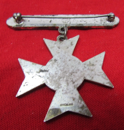 Original era manufacture. Sterling marked on the reverse of the cross and suspension pin. Pinback attachment, with a locking clasp.