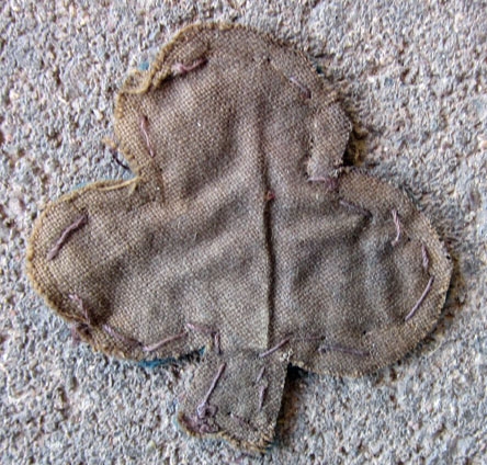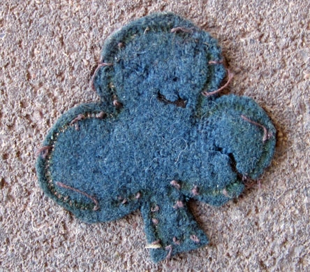 Original period manufacture. Blue wool felt cloverleaf measuring 1.5 inches in width, brown polished cotton reverse. At one time the edge was piped in gold thread, traces of which remain. Mothing to the surface as shown. Normally I cast a jaundiced eye on badges like this, but not in this instance, I like it, had a place in our own collection for several years. Removed from a hat, likely a G.A.R. piece, possibly wartime.