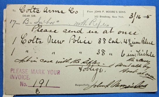 Original period manufacture. Request by the firm of J.P.Moore of NYC to Colt for New Police 38 cal. revolver, blue 4 1/2 inch barrel, and the same with a nickle finish, 6 inch barrel.