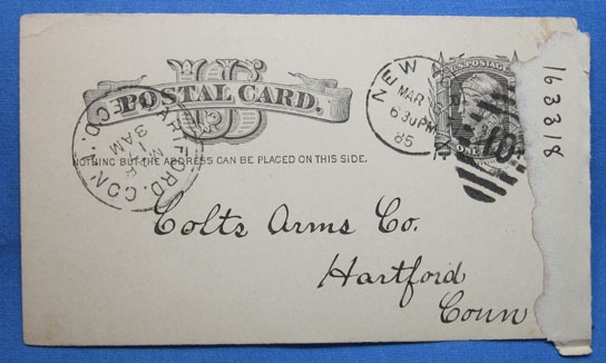 US Indian War Era, Colt Patented Firearms Co., Postcard, J.P.Moore NYC 1885