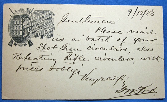Original period manufacture. Request for a "batch" of shotgun circulars, by a Boston Firearms & Hardware store. 1883