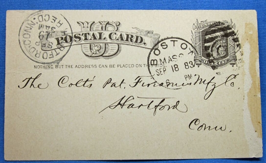 US Indian War Era, Colt Patented Firearms Co., Postcard, Turner & Ross Boston 1883