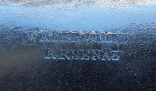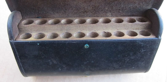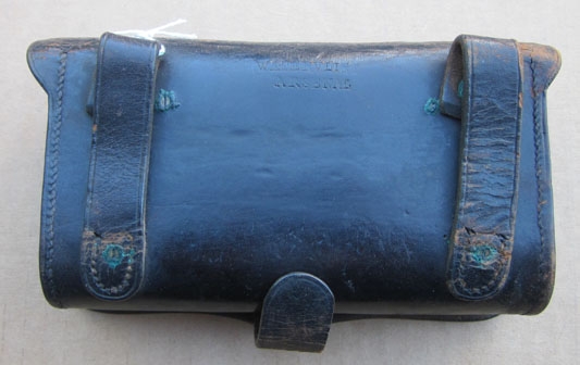 Original period manufacture. Black leather belt pouch with an internal wood black, drilled to hold 20 rounds of 45-70 ammunition. Watervliet Arsenal marked on the reverse. Very clean condition.
