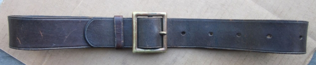 Original period manufacture. Very sound, brown pliable leather with a single prong brass frame buckle. Clear markings on the reverse as shown. Scarce original belt.