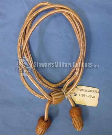 Original period manufacture. Buff cord piped with white, with buff acorns. Old tag attached which identifies it as Quartermaster 1899-1902. Storage wear only
