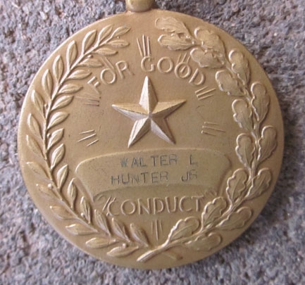 Original period manufacture. US WWII Army Good Conduct medal, slot brooch suspension, named on the reverse to Walter L Hunter Jr.