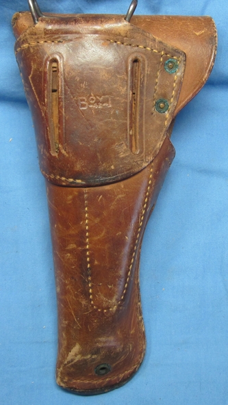 Original period manufacture. Russet leather holster with sound stitching and clear markings. Never oiled, not flattened. Shows scuffing to the surface from handling.