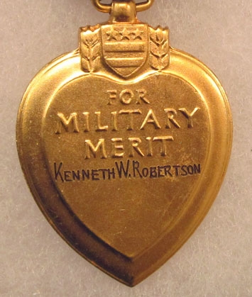 Original period manufacture. Slot brooch ribbon, enameled planchet, named on the reverse to Kenneth W. Robertson. Very clean.