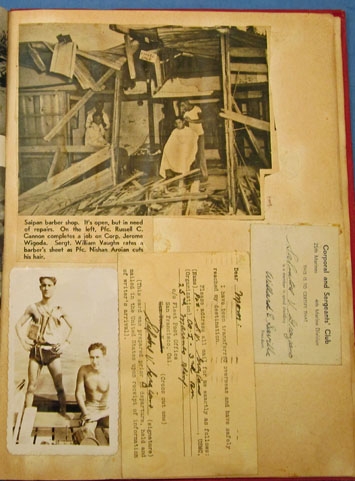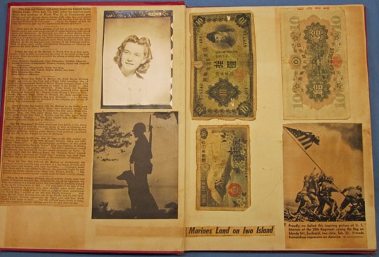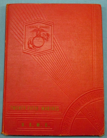 Original period manufacture. Yearbook style presentation, HB, Army & Navy Publishing 1943, 25th Marine Regiment, about 100 pages. The Marine used the blank pages as a scrapbook, placing photos, Japanese money, postcards, passes, newspaper articles on those pages. Included is paperwork regarding his wounding by a Japanese mortar shell fragment on July 25 1944, while fighting on Tinian. A nice personal record of a combat Marine in the South Pacific.